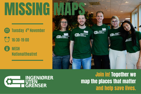 Engineers Without Borders Norway (IUG) has extensive experience hosting Missing Maps events. This autumn, you can join more open mapping sessions at MESH: Tuesday October 7 – Tuesday November 4 – Tuesday December 2. All events run from 16:30–19:00, with good atmosphere, pizza, and meaningful mapping.